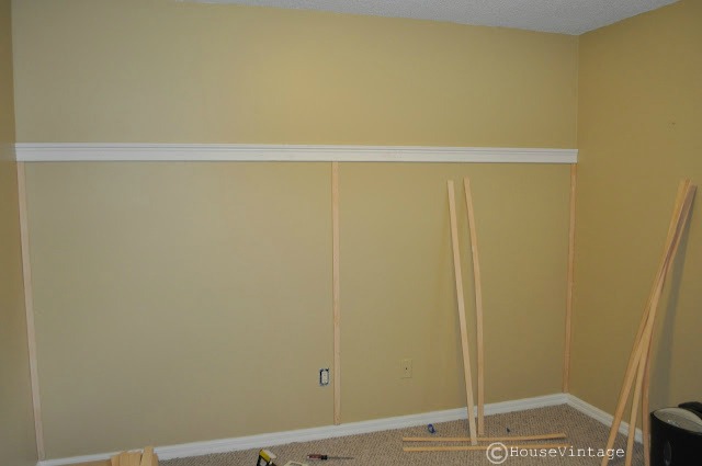I have been reading about board and batten, and pinning all the great DIY tutorials for awhile now. My extra bedroom, which at the moment houses the ironing board and paper shredder (well there are actually two paper shredders, I keep breaking them by shredding too many piece of paper at once :)), needed some architectural detail. It is a very boxy room, with one small window. At some point, this room will probably be an additional guest room. It seems that many of our guests are used to sleeping in a larger bed than the double bed that is in the current guest room. So having an extra sleeping space, even if it is an upgraded air mattress would be ideal. But back to the board and batten...the room needed some interest, and a focal point. Board and batten was the perfect touch, on trend but still a classic wall treatment. And my father-in-law, who is very handy, was in town visiting. Sounds like the perfect time for a house project!
